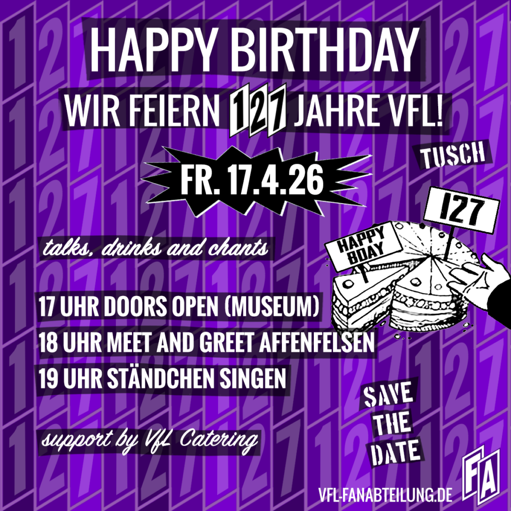 Ob jung oder alt, langjähriger Fan oder neu dabei – kommt vorbei, bringt eure Stimme mit und lasst uns gemeinsam zeigen, was den VfL ausmacht: Leidenschaft, Zusammenhalt und echte Fanliebe.