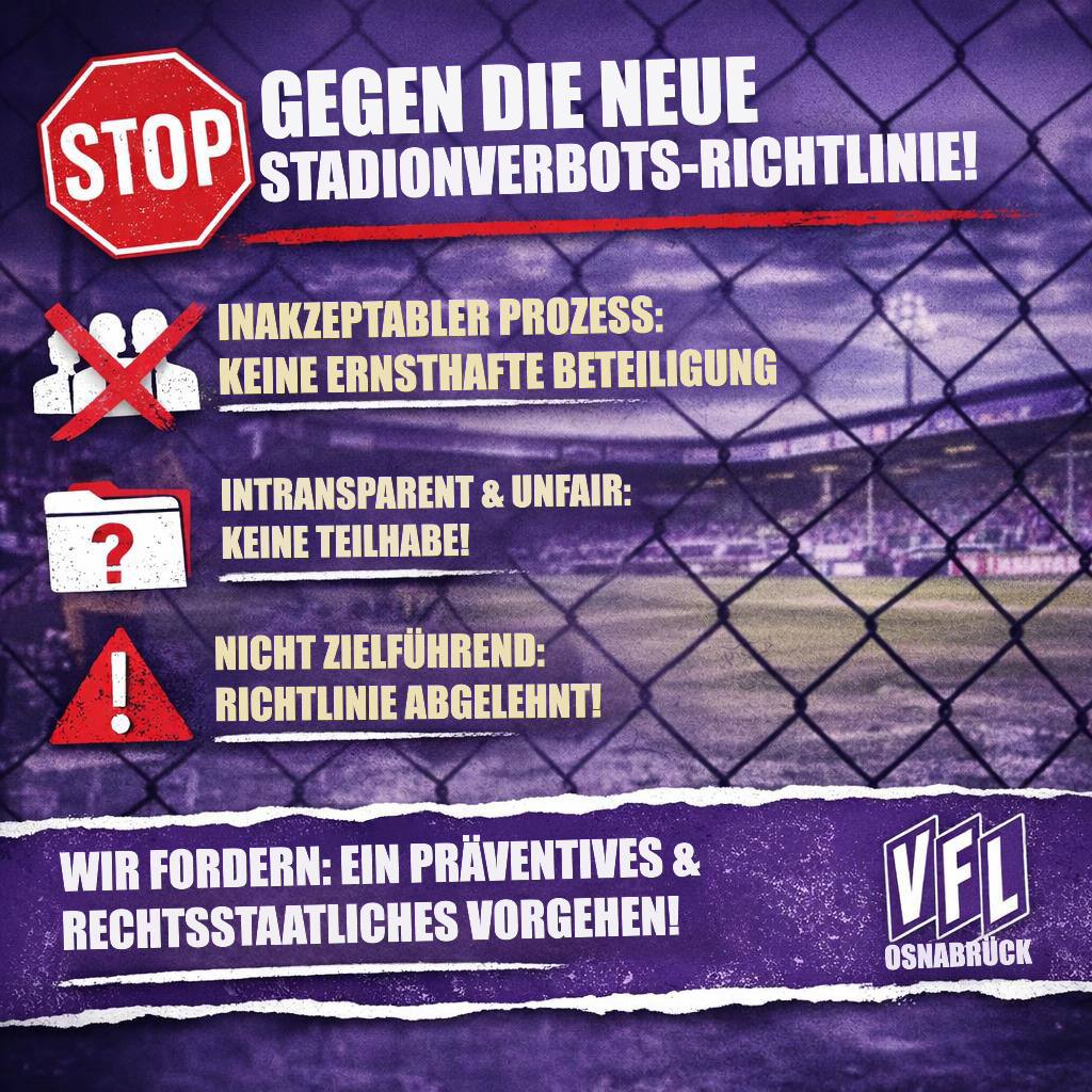 Der VfL Osnabrück lehnt die vorliegende Neufassung der Stadionverbotsrichtlinie ab. Aus Sicht des Clubs ist sie weder zielführend noch geeignet, die angestrebten Ziele zu erreichen. Insbesondere der zugrunde liegende Prozess wird als inakzeptabel bewertet: