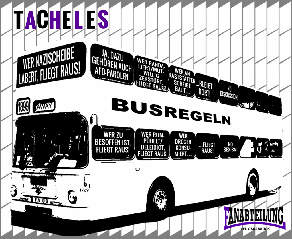 Eine Auswärtsfahrt mit der Fanabteilung macht immer Spaß und so manche Auswärtsniederlage wurde in der Vergangenheit schon durch die Tour selber und das Erlebnis egalisiert. Trotzdem kann es im Bus immer mal wieder zu blöden Situationen kommen. Zwar sind unsere Busbetreuer:innen sehr gut darin Probleme abzuwenden bevor sie überhaupt entstehen, aber damit wir alle zukünftig noch klarer wissen was geht und was nicht, hat die Fanabteilung zu neuen Saison verbindliche Busregeln eingeführt. Diese muss jede:r mit der individuellen Buchung akzeptieren,